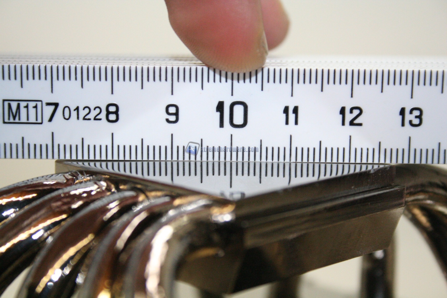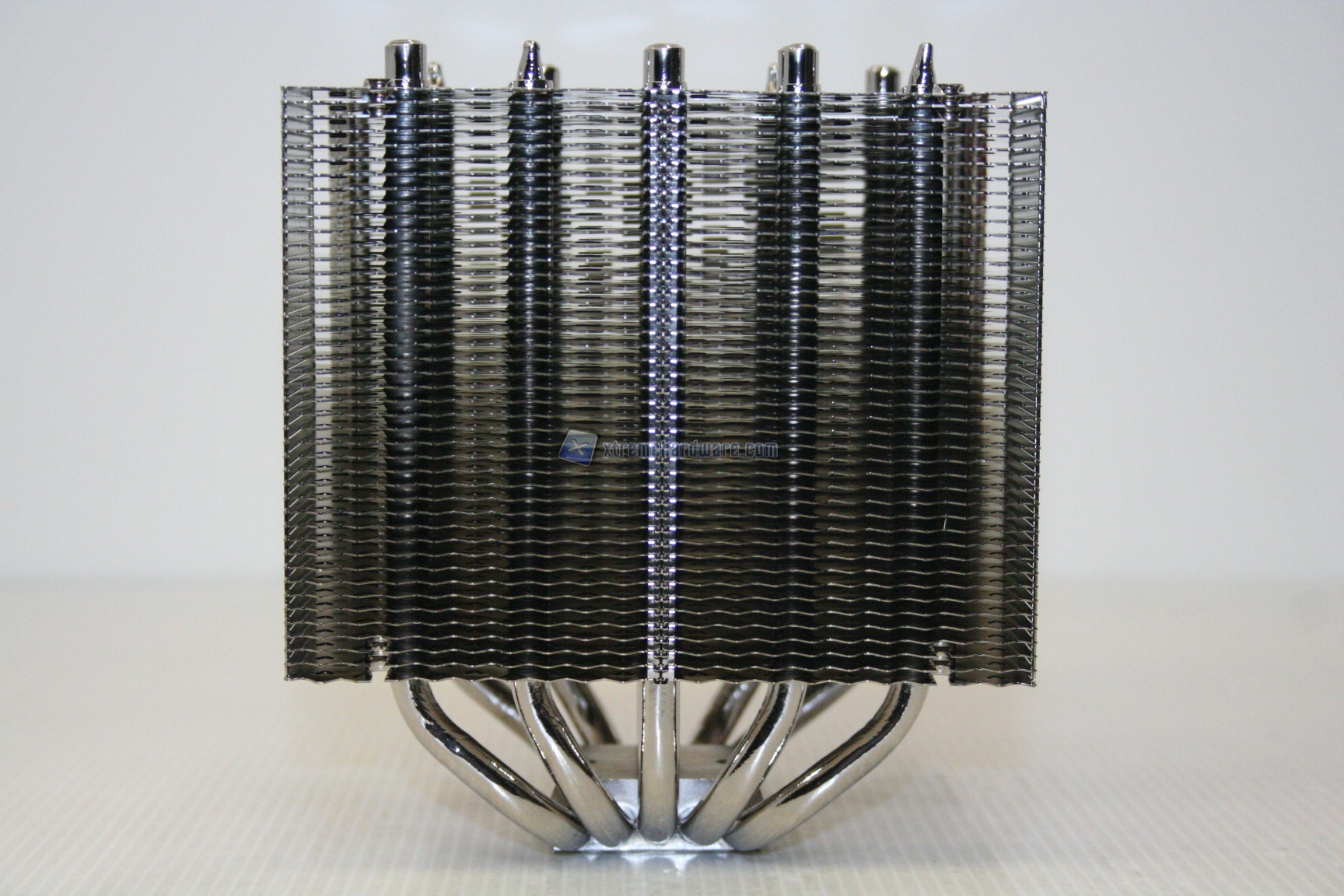 La base presenta una superficie leggermente convessa, ed è una caratteristica di quasi tutti i modelli usciti in commercio da anni, ad aria e con base non HDT/CDC. E’ intenzionale poiché ovvia a problematiche potenziali di contatto con l’IHS della CPU spesso ricurvo a causa del sistema di ritenzione della scheda madre. Sul socket LGA 2011, questo problema non è presente e tale accorgimento non è a nostro avviso necessario: anche i dissipatori con superficie perfettamente planare generalmente riescono ad avere un’ottima impronta e quindi buone prestazioni.