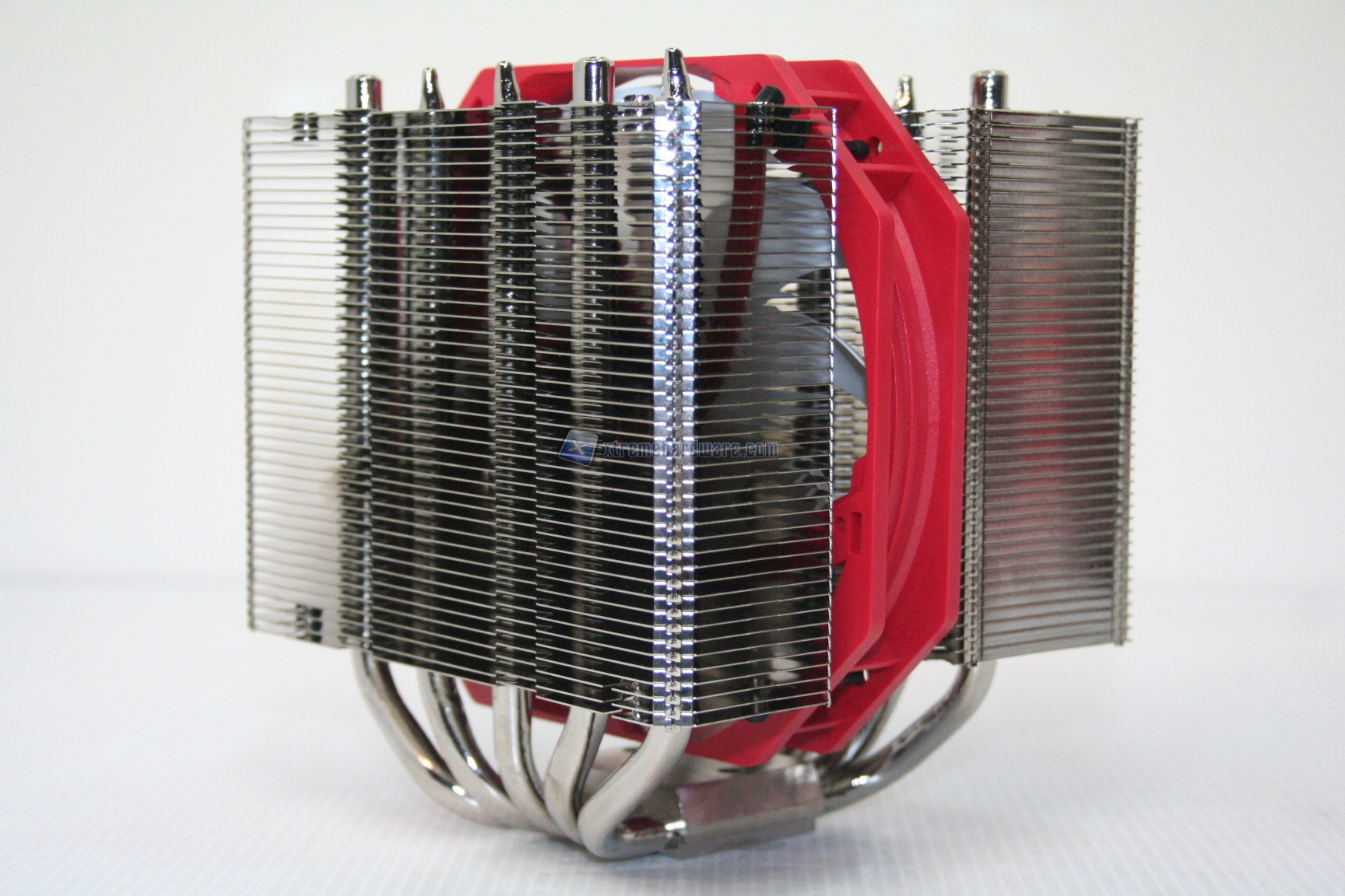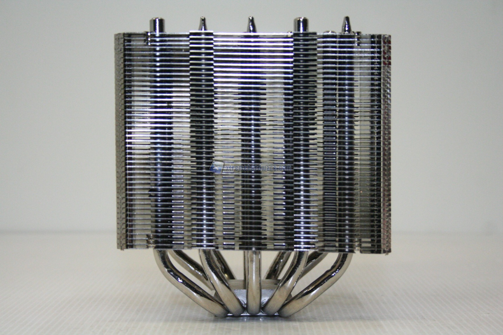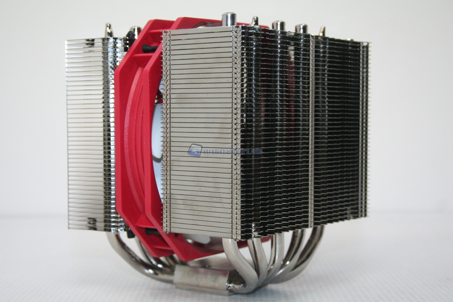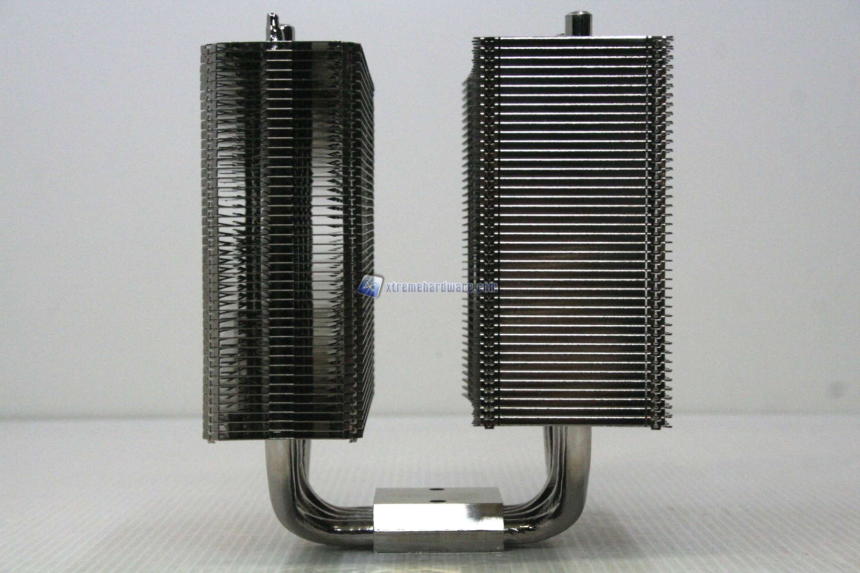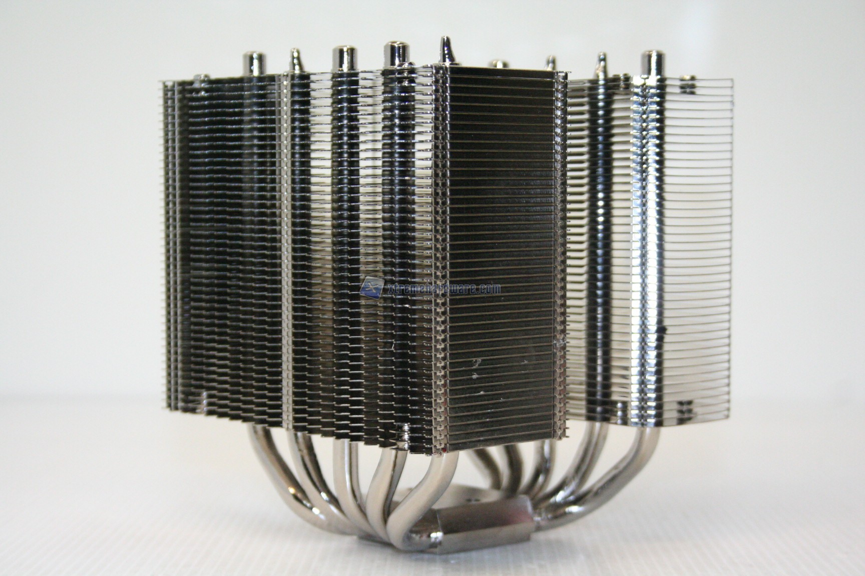 Il Tisis appartiene alla famiglia dei dissipatori a doppia torre di raffreddamento, quindi con una elevatissima superficie dissipante ed una innata predisposizione per ventole aventi bassi regimi di rotazione. Sotto questo punto di vista il Tisis è eccelso; come vedremo presenta una dissipazione semi-passiva fenomenale, complice anche l’adozione di due ottime ventole da 140mm. Presenta 5 heatpipes ad “U” da 8mm, distribuite uniformemente al centro di ogni torre di raffreddamento. Nella torre anteriore, è presente un profilo con un motivo strutturale simile al modello Noctua NH-D14, ed infatti preannunciamo che il Tisis riuscirà a competere molto bene con la versione Noctua. Al centro è presente una curvatura verso il centro della torre, che permette una migliore organizzazione dei flussi in uscita, e quindi in immissione verso la ventola centrale. Tale accorgimento non è affatto peculiare, poiché nel corso degli anni si è reso necessario per migliorare il profilo di ventilazione interno in associazione alla zona morta di ventilazione, derivante dal diametro elevato del motore.
