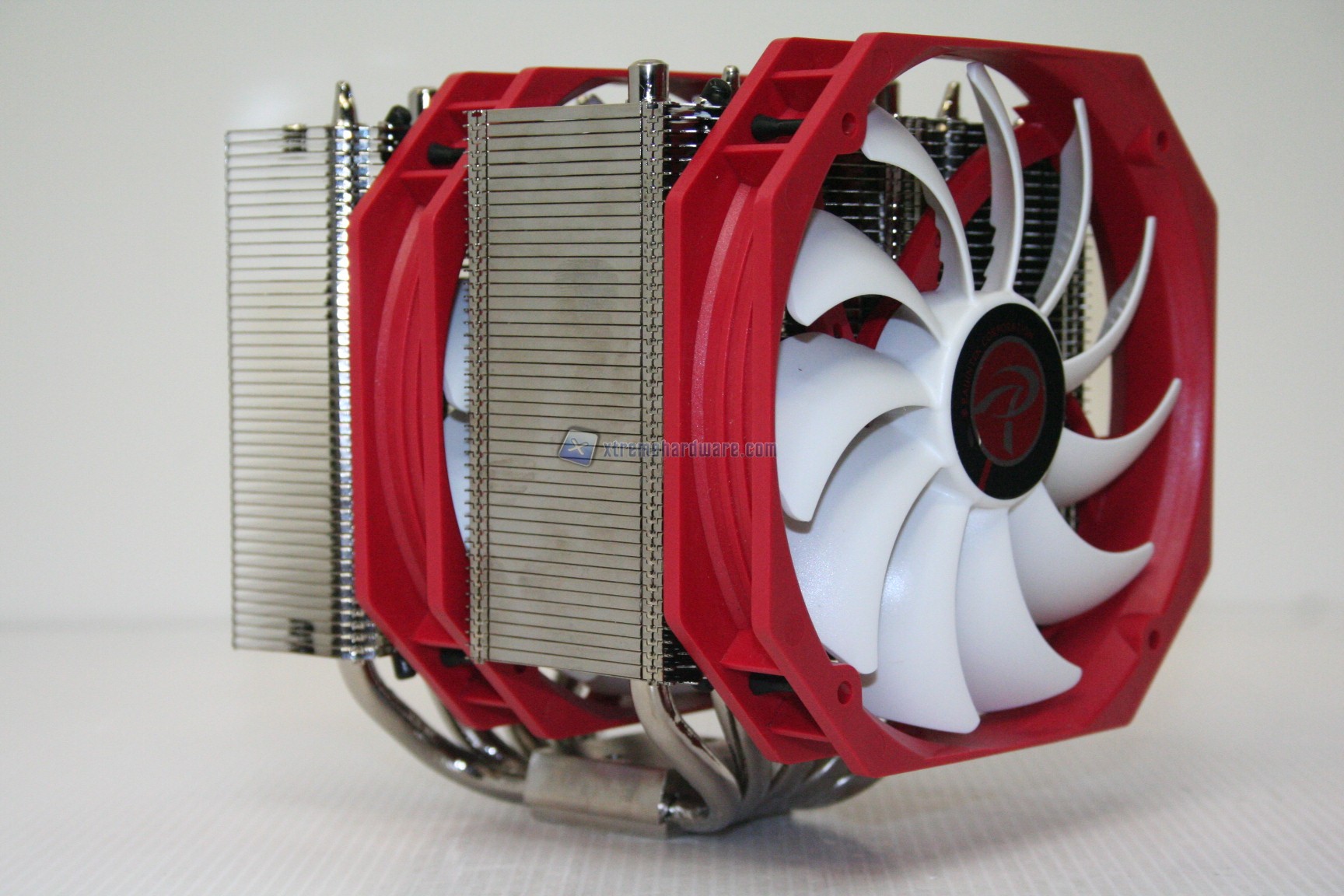 Osservandolo dall’alto notiamo tutta una serie di dettagli strutturali delle singole alette di raffreddamento, compreso un doppio profilo posteriore sulla seconda torre, rialzato. Lateralmente possiamo osservare il peculiare, e scomodo, sistema di incastro delle ventole, che purtroppo rappresenta uno dei punti a sfavore di questi modelli Raijintek. A conti fatti sarebbe opportuno trovare una soluzione alternativa. La larghezza del dissipatore è importante, ma non eccessiva, o tale da compromettere l’installazione di VGA a ridosso del radiatore. Il feeling iniziale è ottimo in quanto ci si rende subito conto del fatto che anche questa volta il produttore ha cercato di massimizzare la qualità del progetto, anche se è presente una punzonatura delle alette di raffreddamento.