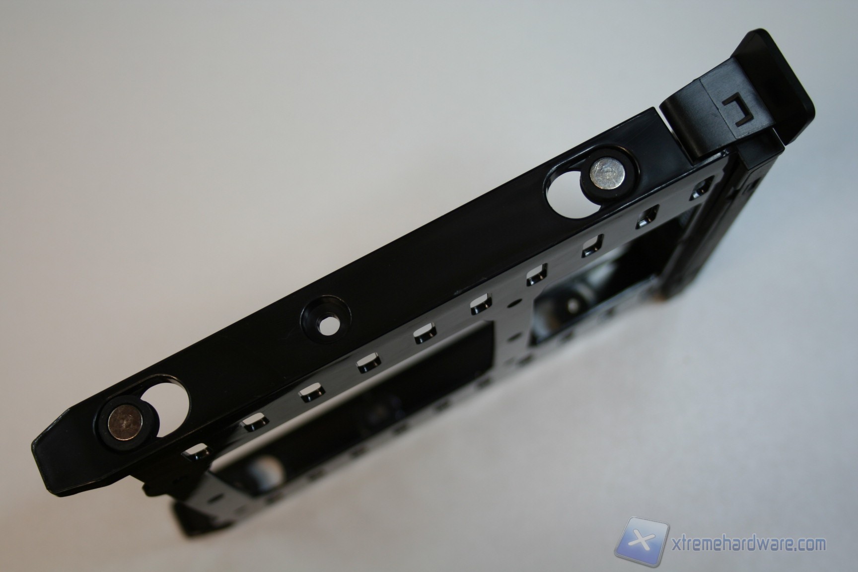 Nella parte inferiore invece sono stati installati due cage, removibili grazie a semplici viti di ancoraggio, che permettono l’installazione di altri 6 hard disk e che ne permettono la ventilazione grazie a due ventole da 120mm preinstallate, le quali vengono connesse direttamente al sistema di regolazione nel pannello superiore. Questo sistema permette la regolazione della ventilazione interna, e conseguentemente sia della rumorosità che delle temperature. Ovviamente questo supporto per le ventole può essere aperto grazie ad una levetta, tramite un movimento orizzontale di 90 gradi in senso orario, ma può anche essere rimosso qualora fosse inutile, o qualora dovesse servire uno spazio maggiore.
